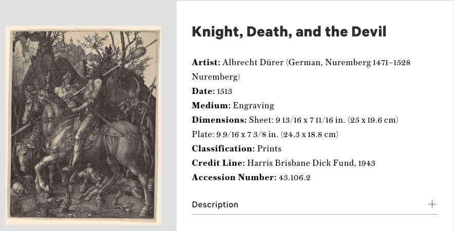 其二呢,是丢勒的这幅版画《骑士、死神与魔鬼》。